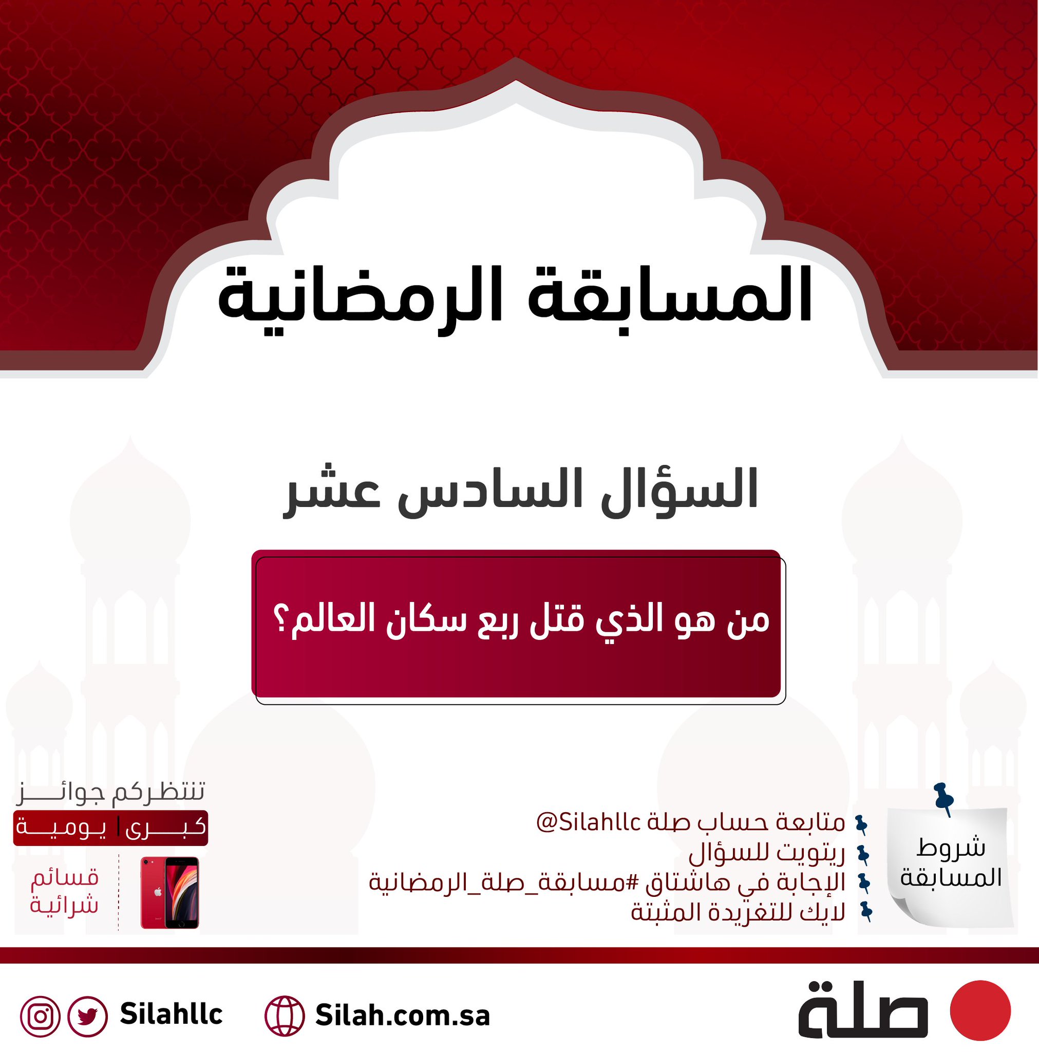 صلة On Twitter سؤالنا السادس عشر لـ مسابقة صلة الرمضانية من هو الذي قتل ربع سكان العالم اط لع على الشروط في الصورة السحب غدا عشوائيا من الهاشتاق الساعة ١٠ ٣٠ مساء فالكم الفوز
